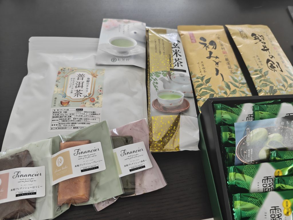 Sachets de thé (genmaicha, puerh…), financiers, mochi au thé.