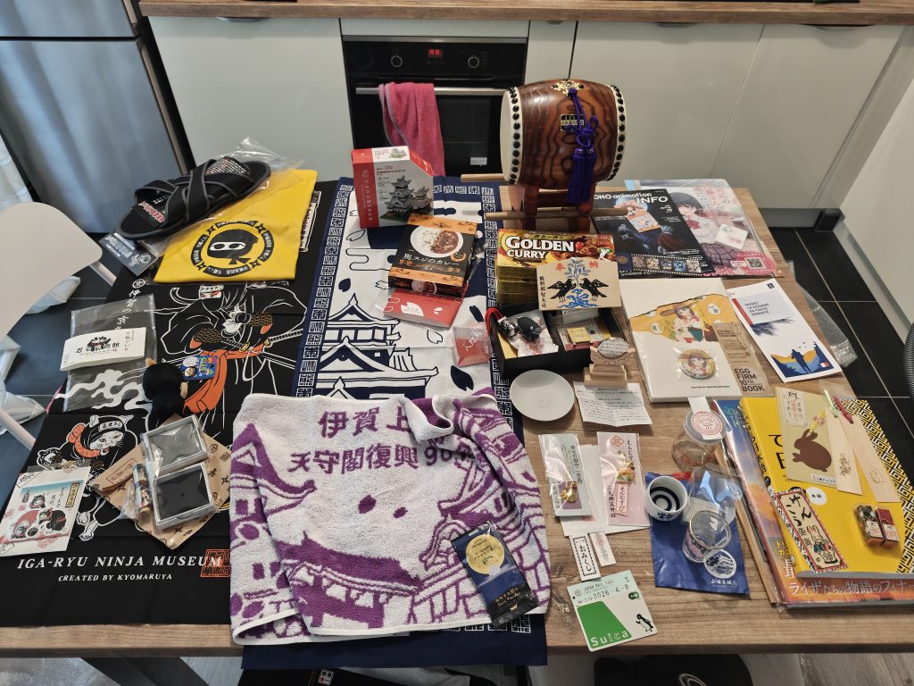 De gauche à droite : souvenirs de Iga orientés ninja (tshirt, tongs, shurikens, stickers, tenugui, serviette), souvenirs de Kumamoto (tenugui, nanoblock, curry au cheval), taiko de Hamamatsu, curry jap, souvenirs de Nachi (clochette, assiette, plaque ema, statuette du corbeau), souvenirs de Ise et Meotoiwa (miroir, amulettes pendentifs), omikuji de Kusatsu, goodies divers de Anime Japan 2026 (pochette plastique, livre des 10 ans de Egg Firm), dépliant de la douane française, pot de pudding de Kusatsu, tasse de dégustation de saké Kikusui Garden, verre à shot de Odawara, livres divers, marque pages et tampons de Ise.