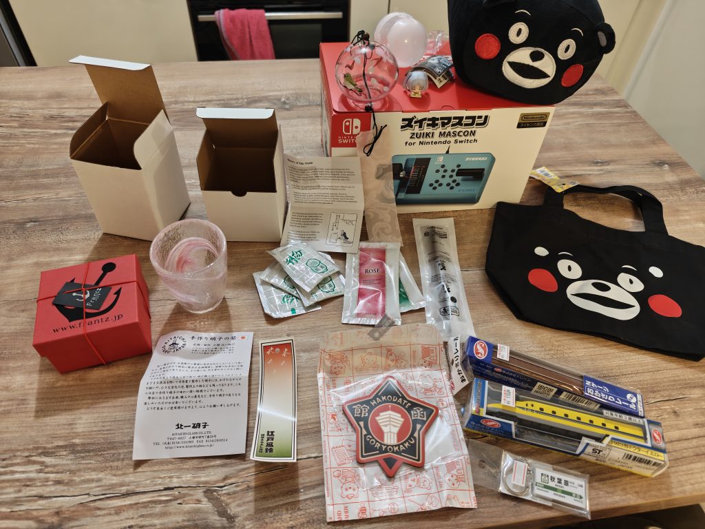 De gauche à droite : gateaux omiyage, verre de Otaru, sachets de thé d’hotels, carillon de Edo Fuurin, mini figurine Frieren qui dort, contrôleur Switch pour jouer aux trains, sels de bains d’hotels, dessous de verre Goryokaku Hakodate, brosse à dents d’hotel, peluche coussin Kumamon, sac à bento Kumamon, articles trains miniatures, porte-clés panneau station Akihabara.
