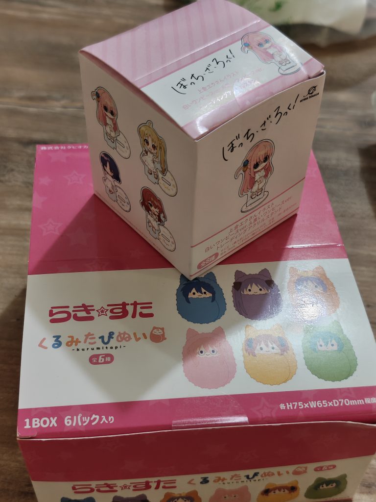Boite de 6 peluches (kurumitapi) Lucky Star, boite de 8 mini standees Bocchi The Rock, de Anime Japan 2026.