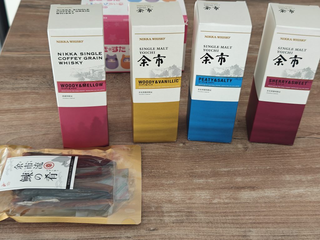 4 bouteilles de whisky (1 déjà consommée donnée) de Nikka Whisky à Yoichi, harengs en jerky de la distillerie.